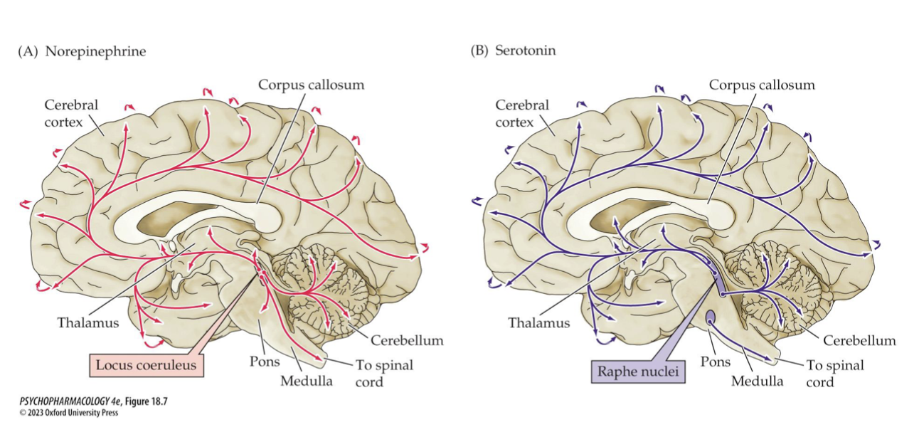 originate in NE: LC; 5-HT: raphe nuclei.