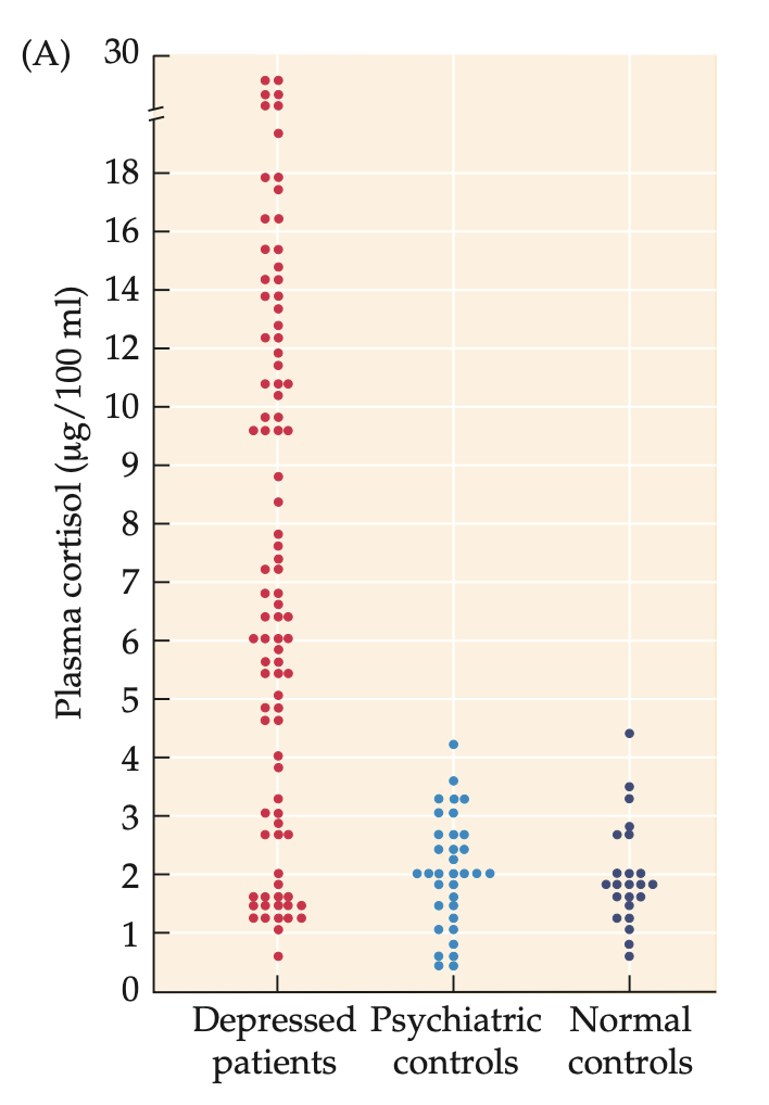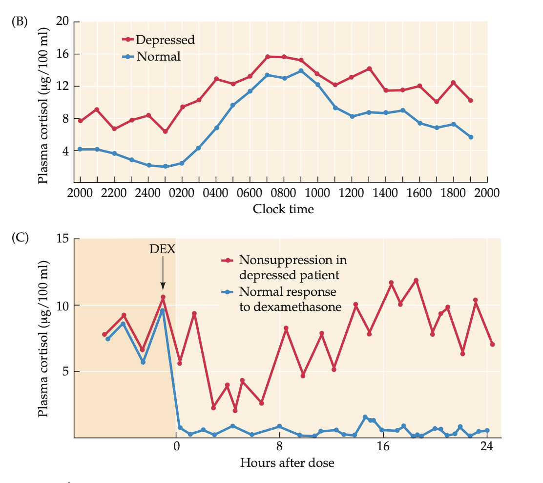 Depressed individuals fail to respond with reduced cortisol levels after injection with 1 mg dexamethasone (DEX).