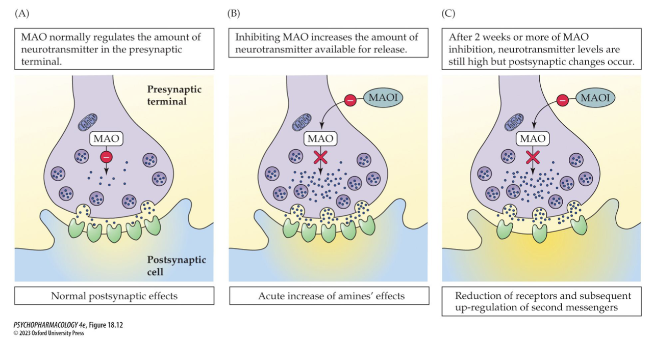 _____ are the oldest antidepressant drugs → inhibition of MAO = ____ in the amount of NT available for release BUT neuron adaptation involving ∆ in _____ or ____ function must play a role in effects → examples (3)