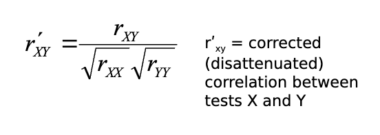 The correction for attenuation formula estimates what the correlation would be if both variables were perfectly reliable (no measurement error). It reveals the true/latent relationship between the variables.