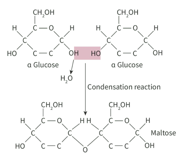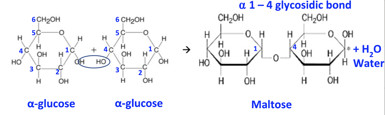 OH group on carbon-1 of one glucose attacks the -OH group on carbon-4 of the other glucose molecule