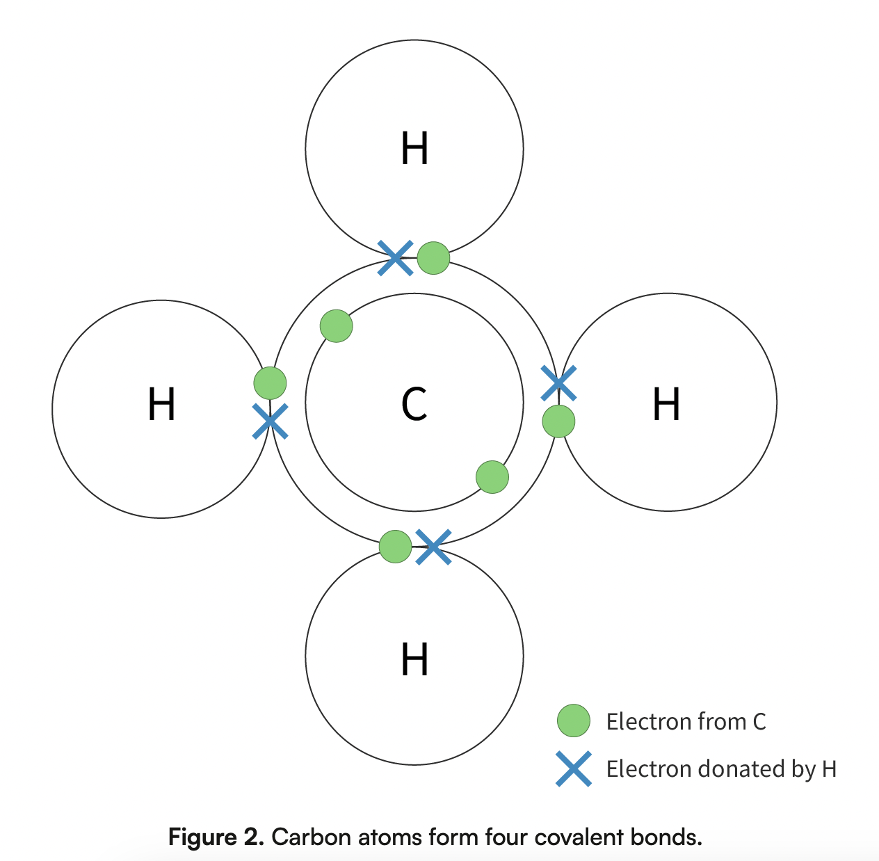 Carbon atoms has 4 electrons in its 2nd electron shell and can form 4 covalent bonds (borrows), allowing for a variety of stable compounds to exist