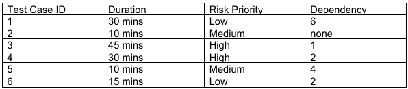 Apply test case prioritization. You have been given the following set of test cases to run. You have been instructed to run them in order by risk and to accomplish the testing as quickly as possible to provide feedback to the developers as soon as possible.