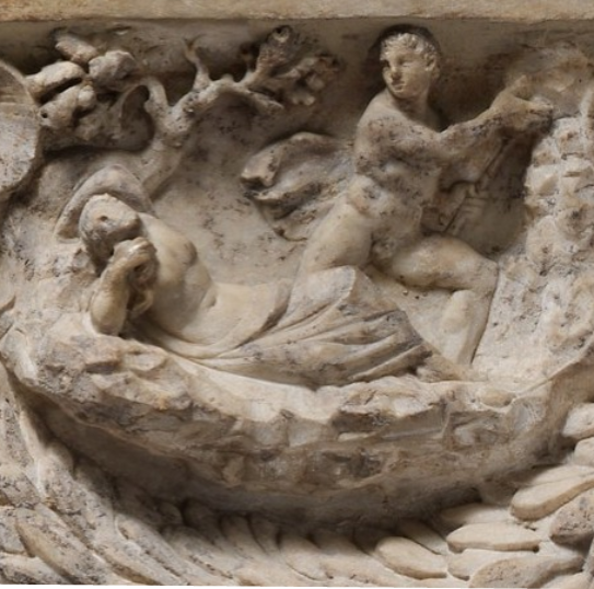 Endymion is dressed like a hunter, the other noticeable thing is that the faces haven’t been carved- example of a sarcophagus that was in the process of being made as an example for other sarcohogai (inscription space left with no inscription)