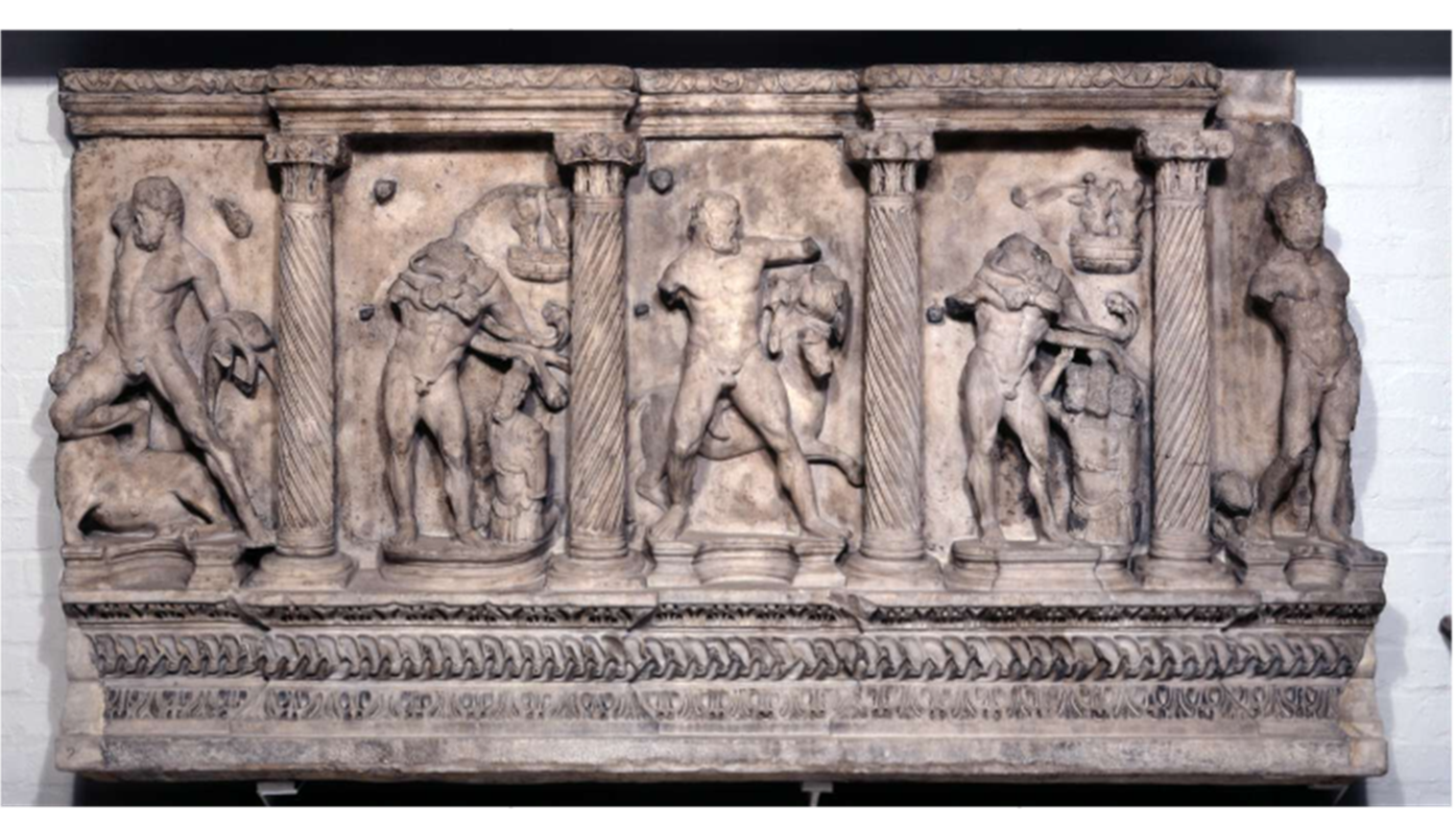 Frieze in the upper part possibly the Nereids, below this there are three large figures of women holding up very large garlands, the garlands are made up of flowers, pinecones and leaves. Two little vignettes within the garlands- mythological imagery. Both of these refer to the myth of Actaeon, on the right we have Artemis bathing and on the left Actaeon is being attacked by the hounds. On the ends there were two further scenes relating to the myths, the prep for them going hunting and his funeral