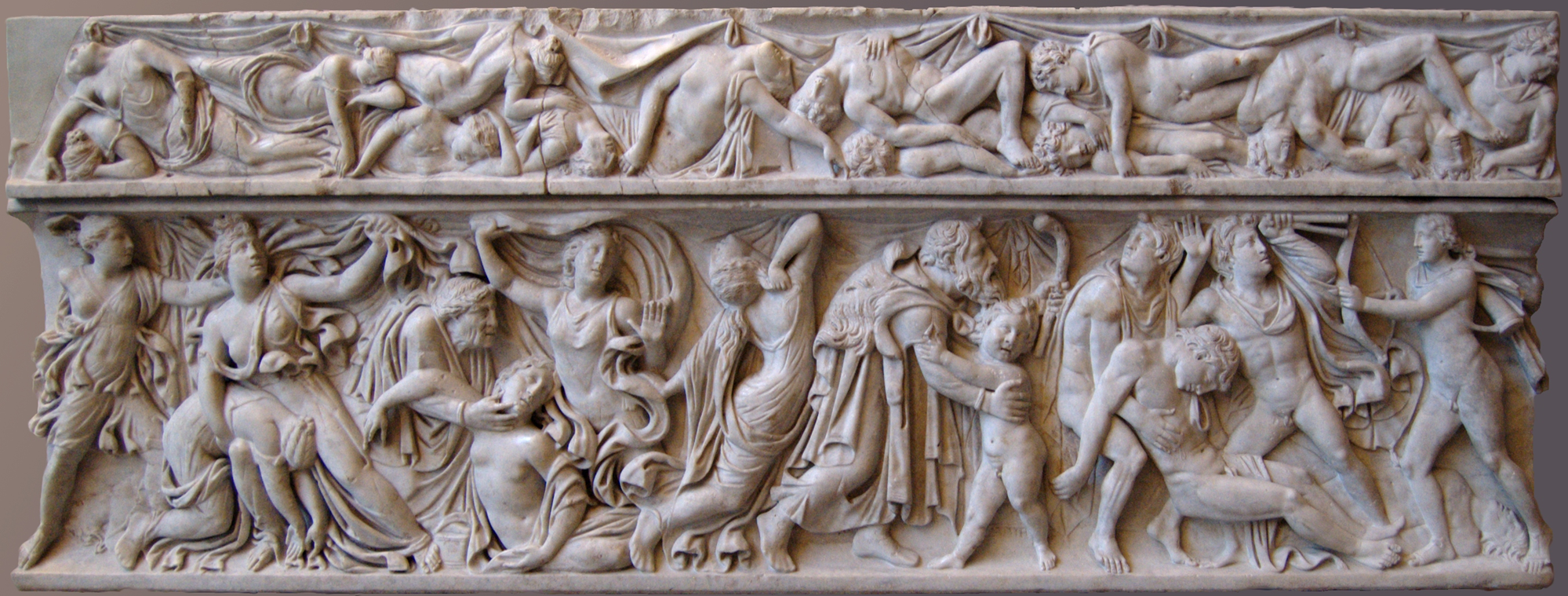 Yes, cruelty of death perhaps? Was in a tomb chamber with another sarcophagus depicting the Niobids.