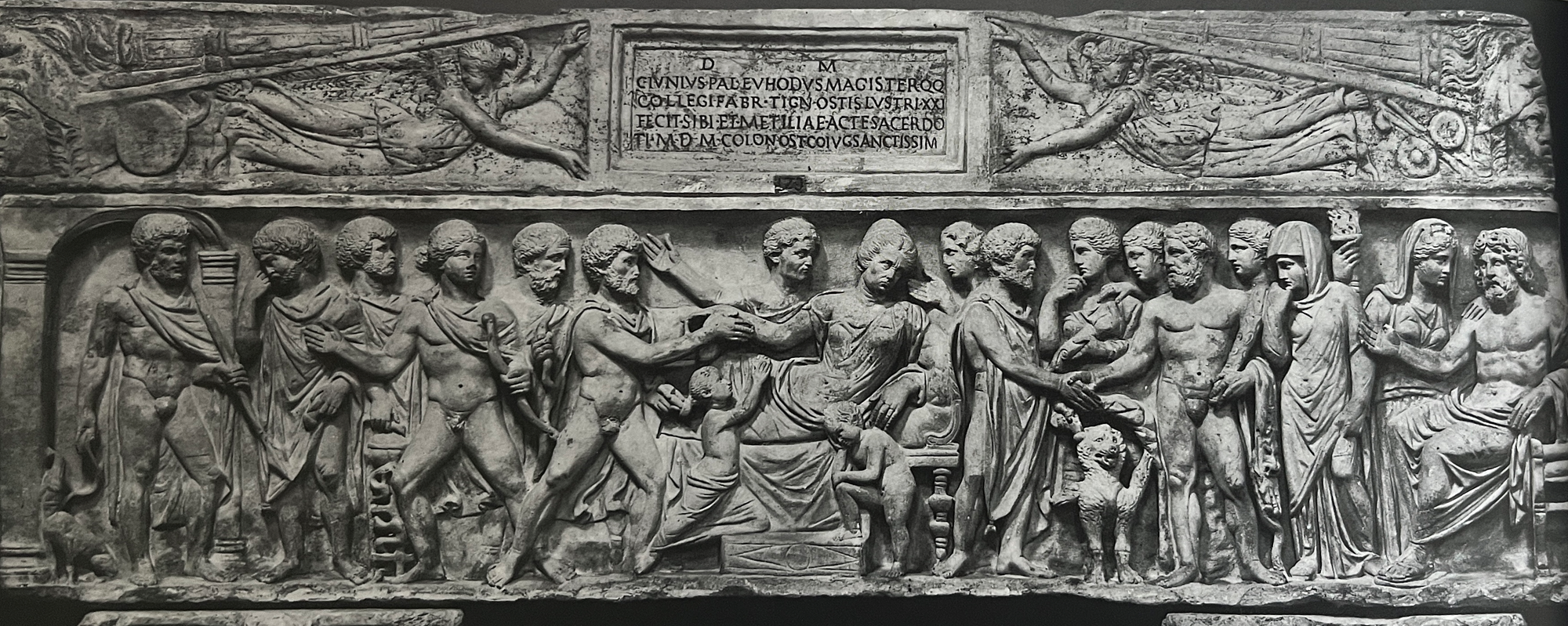 The upper relief is a bit of a contrast, it shows meleagres body benign brought home in a procession, his body is larger than the other figures which communicates his heroic nature, his mother is at the far right- this is supposed to be the moment she is committing suicide at his tomb, another aged figure is on the right side leaning on a stick