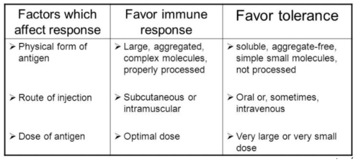 Immunogen or tolerogen: (factors the favor immune vs tolerance response) [physical form, route of injection, dose of antigen]