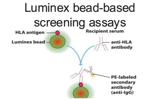 unique HLA antigen on each bead, then detect fluorescent marker for what specific bead it is