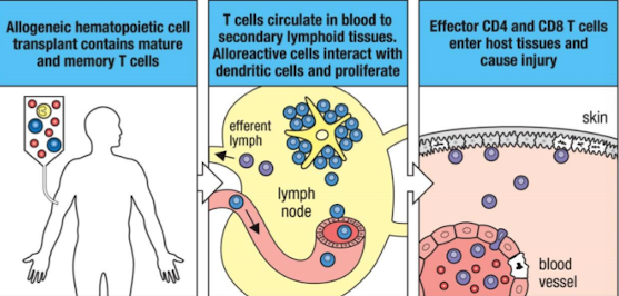 It can arise after a transplantation, particularly in allogeneic transplants, and may cause symptoms such as skin rash, liver dysfunction, and gastrointestinal problems.