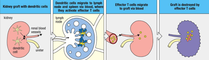 Leave transplanted tissue and migrate from the graft to lymph nodes → T cell activation