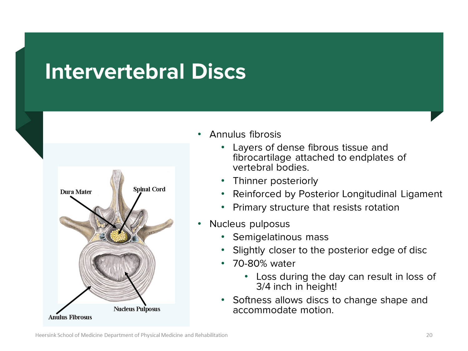 Intervertebral Discs are cushion like pads in between the vertebrae that function as shock absorbers. There are two main parts