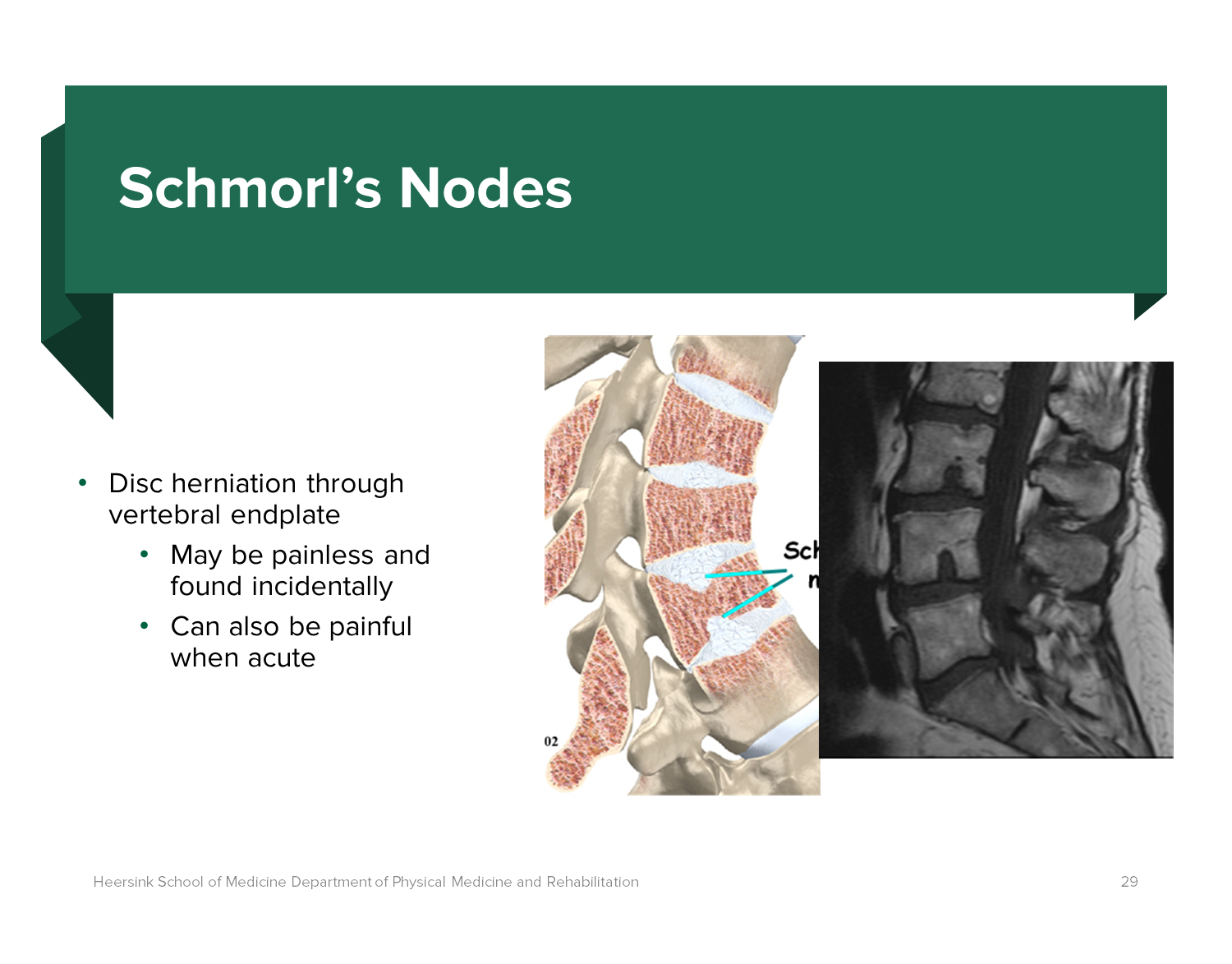 Schmorl’s Nodes are disc herniation upward or a disc herniation into the vertebral endplate