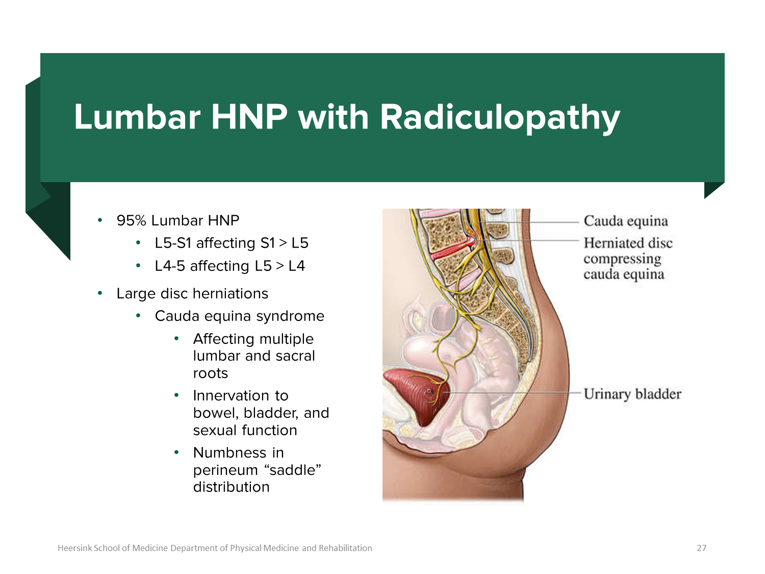 Cauda Equina Syndrome is a medical emergency due to compression of the cauda equina, the bundle of spinal nerve roots at the end of the spinal cord (L1-L2). It is a severe radiculopathy