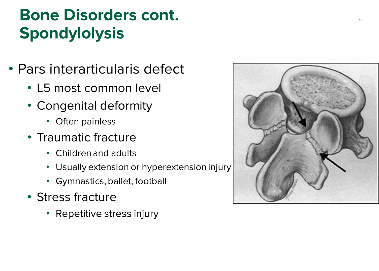 Spondylolysis is a stress fracture in the pars interarticularis of the vertebrae, or the bony bridge connecting the superior and inferior articular processes
