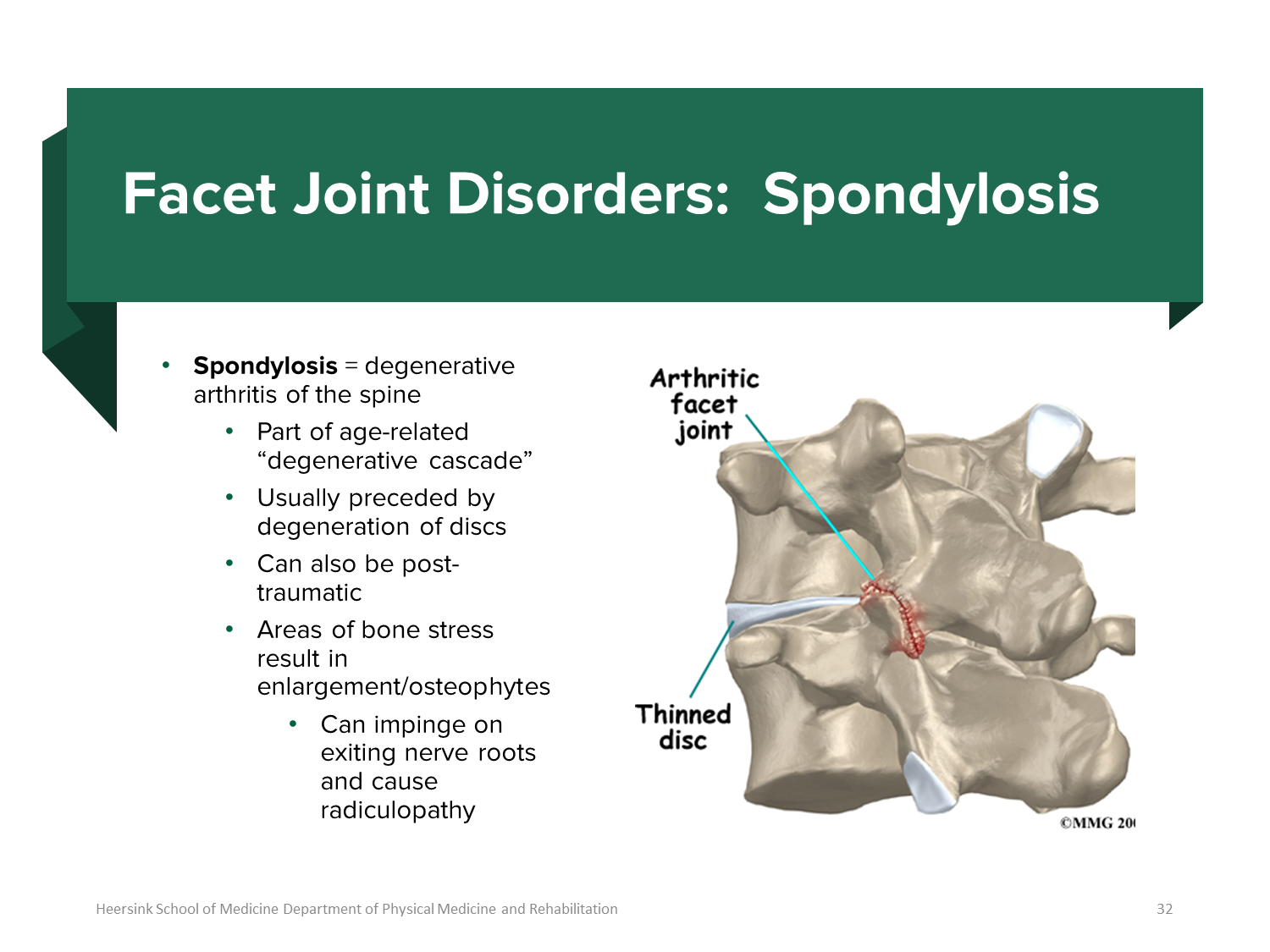→ can cause the growth of osteophytes or bone spurs in areas of stress that can impinge nerves
