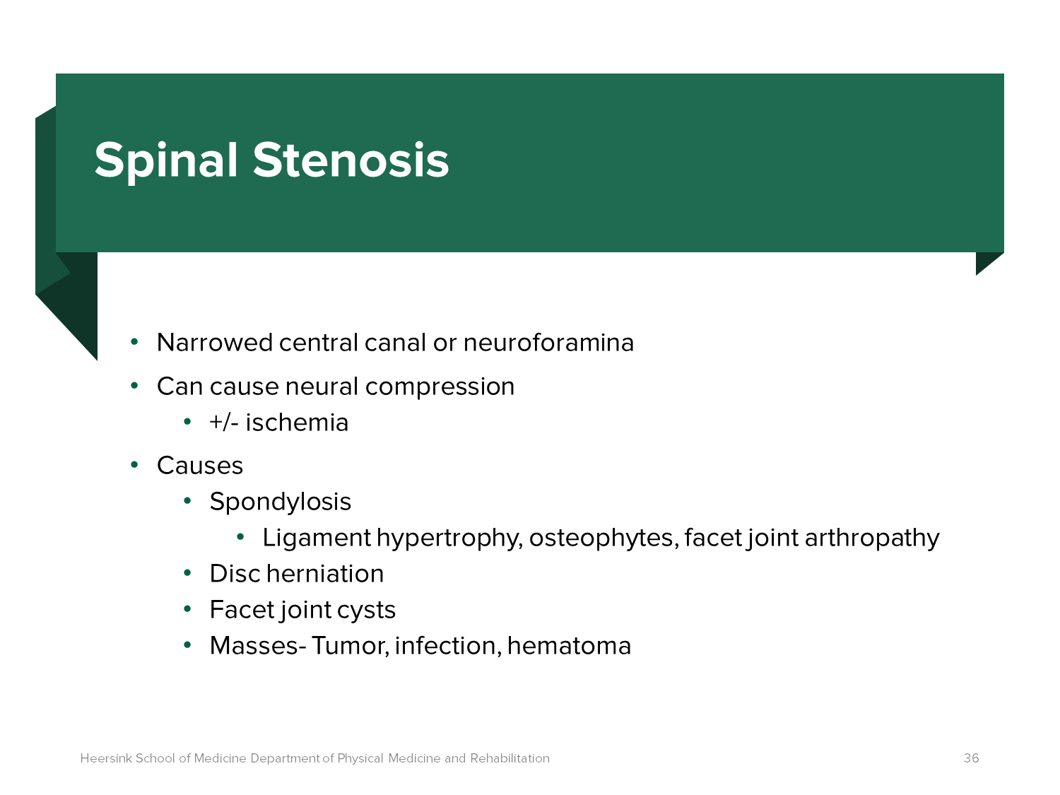 Spinal Stenosis is narrowing of the spaces within the spinal canal or neuroforamina which can lead to compression of the spinal cords or nerve roots
