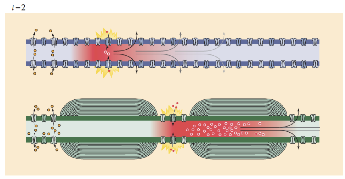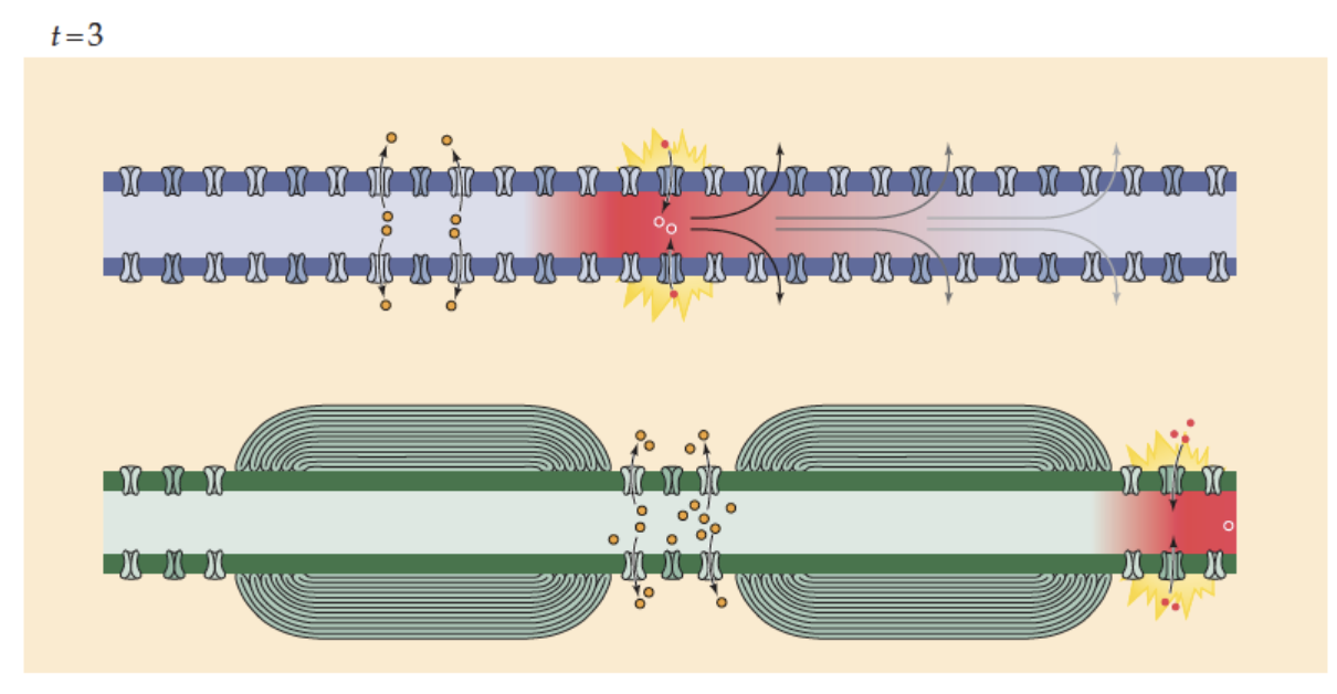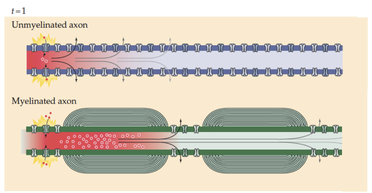Myelinated axons: faster conduction (less leak, saltatory jumping)