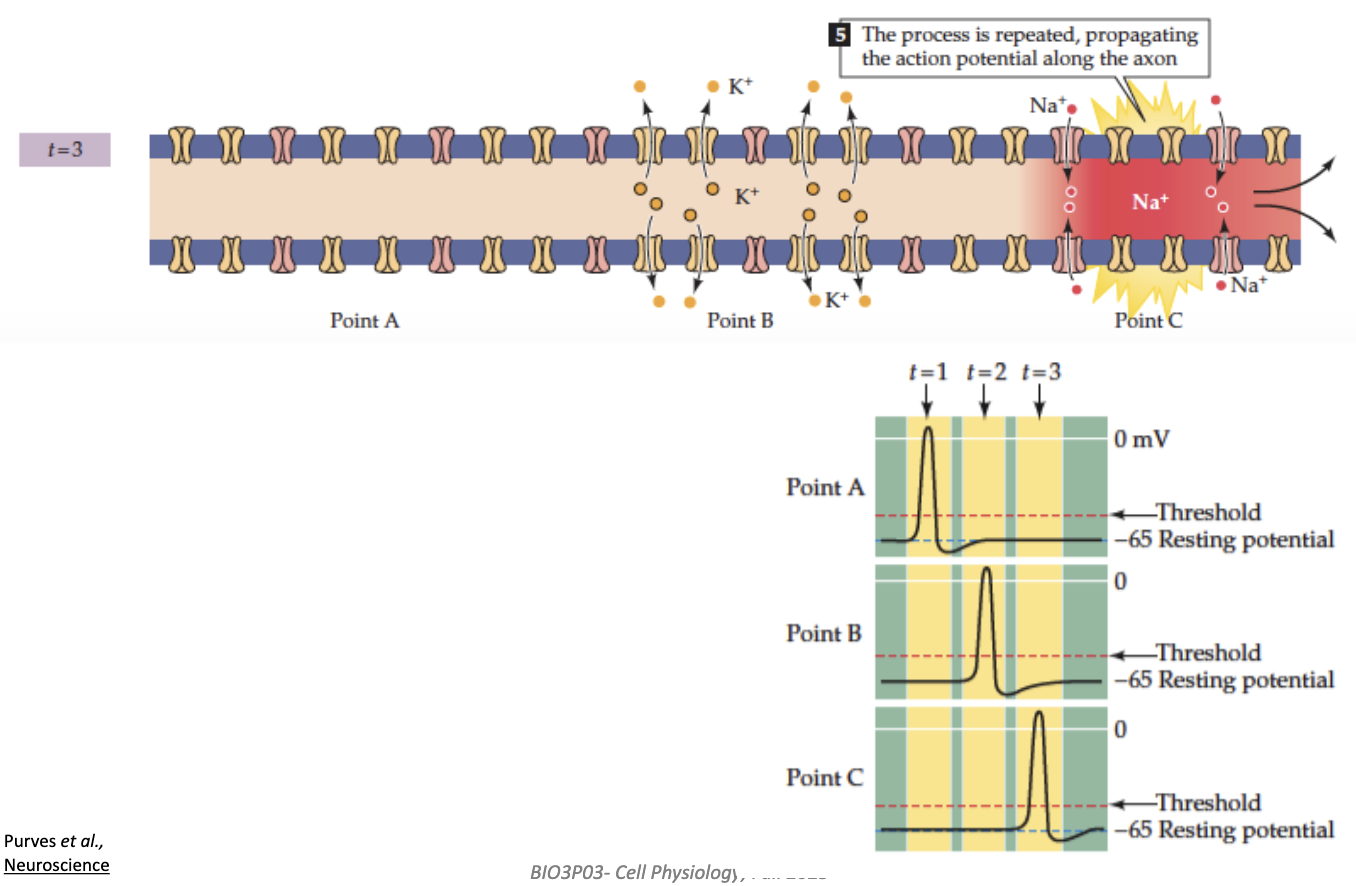 Voltage-gated ion channels along the axon allow AP to regenerate