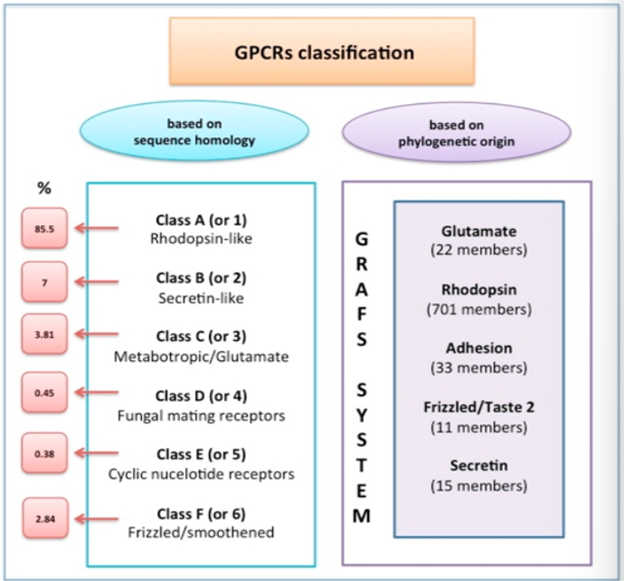 Can be classified by the name of the family, called the GRAFS system, which creates distinct classes of: Glutamate, Rhodopsin, Adhesion, Frizzled/Taste2 and Secretin