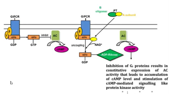 toxin covalently inhibits the Galpha I subunit and makes you unable to decrease the levels of cAMP, causing it to accumulate to toxic levels