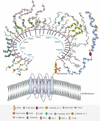 Have a unique hybrid structure – classic 7TM domain, but have very long N terminal region which contains the GAIN domain