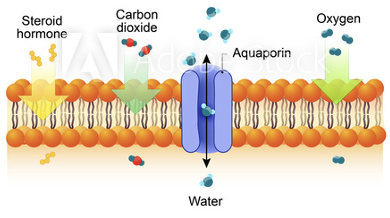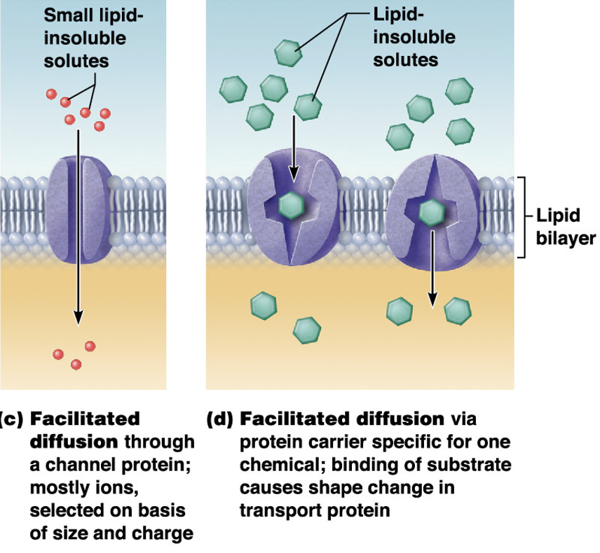 small water-soluble material cross through water-filled channels, e.g. Na, K, Ca