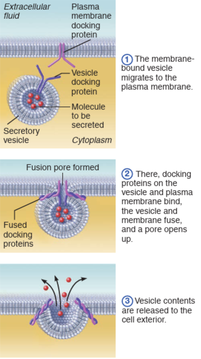 Vesicle migrates to plasma membrane, fuses w/ it & then ruptures, spilling its content out of the cell
