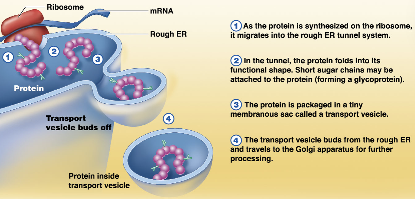 rough – studded w/ ribosomes; synthesises proteins; transport vesicles move protein w/in cell