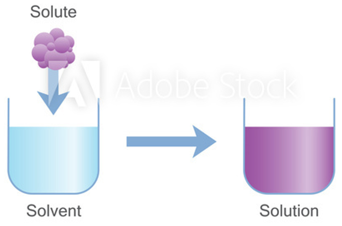 solvent: dissolving medium present in larger quantity; body’s main solvent is H2O