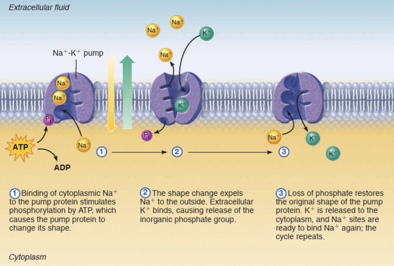 sodium-potassium pump in cell membranes (esp. nerve cells) – carries Na+ ions out of & K+ ions into the cell (necessary for transmission of nerve impulses