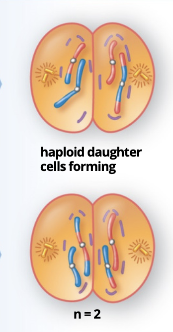 Daughter nuclei are haploid, having received one duplicated chromosome from each homologous pair