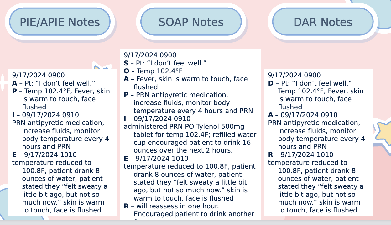 Nursing documentation provides a record of the patient’s status, events, tests, procedures, changes in condition, actions taken by the nurse, patient response, and outcomes.