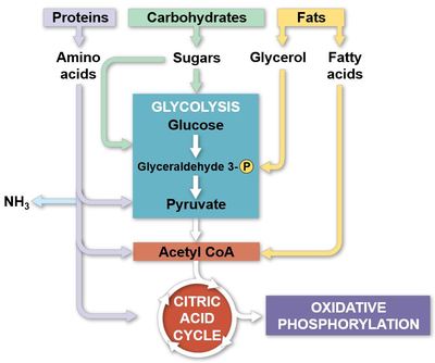 food → glycolysis → citric acid cycle → NADH → ATP