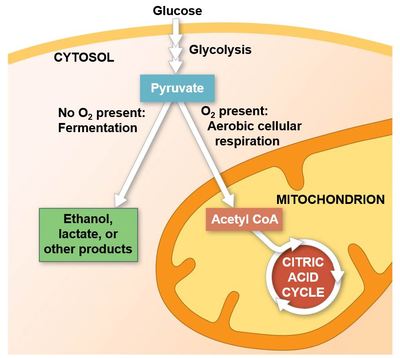 Most of the free energy available from the oxidation of glucose remains in pyruvate, one of the products of glycolysis.