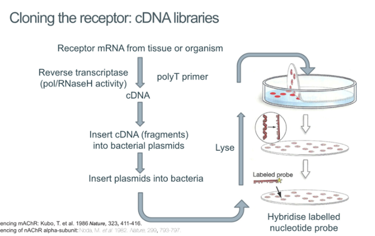 Insert plasmids into bacteria and plate the bacteria, lyse them and hybridise the DNA using a labelled probe which allows you to work out which bacteria contain the cDNA of the receptors that we’re interested in