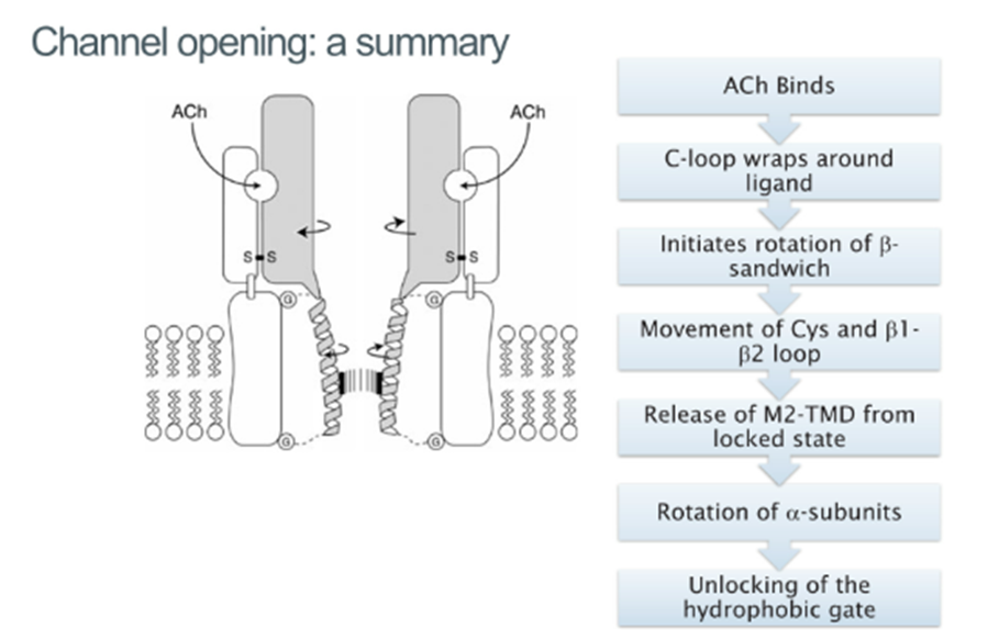 Activation involves ligand binding sequentially of 2 Ach molecules (microsecond timescale), the channel remains open for a few milliseconds and rapidly, the receptor becomes desensitized and the channel closes and so difficult to study the open structure as its very transient