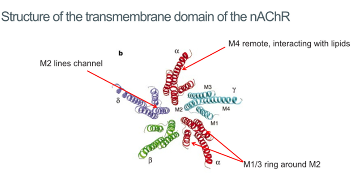 5 subunits all come together and contribute their second TM domain to form this pentameric structure which is a channel going through the membrane