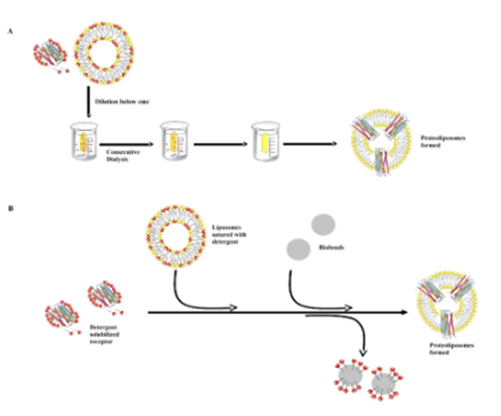 Dialysis: if you have low conc of detergent its now a monomer (not in a micelle) and monomers leave the dialysis bag → protein is taken up into the lipid vesicle