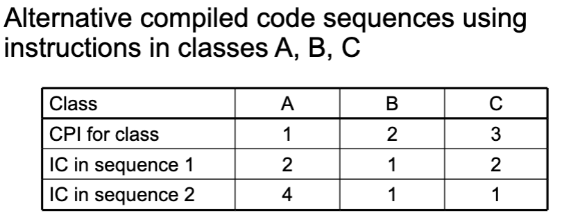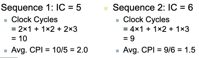 CPI = Clock Cycles / Instruction Count = summation (CPIi x ICi / IC)