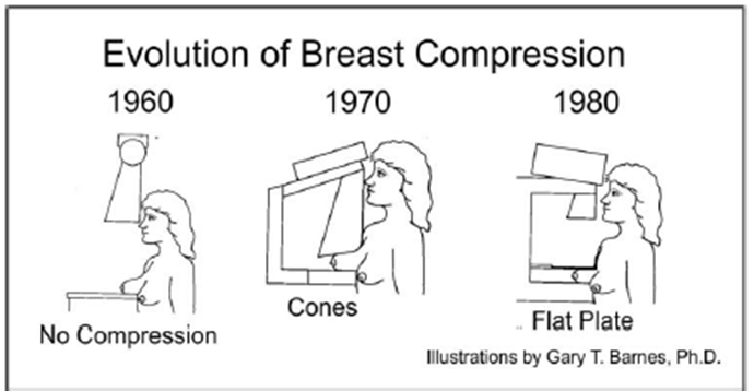 •1970s: specific mammography X-ray systems were developed, some type of compression and breast stabilisation was included by the X-ray beam cone and sometimes with soft components in contact with the breast