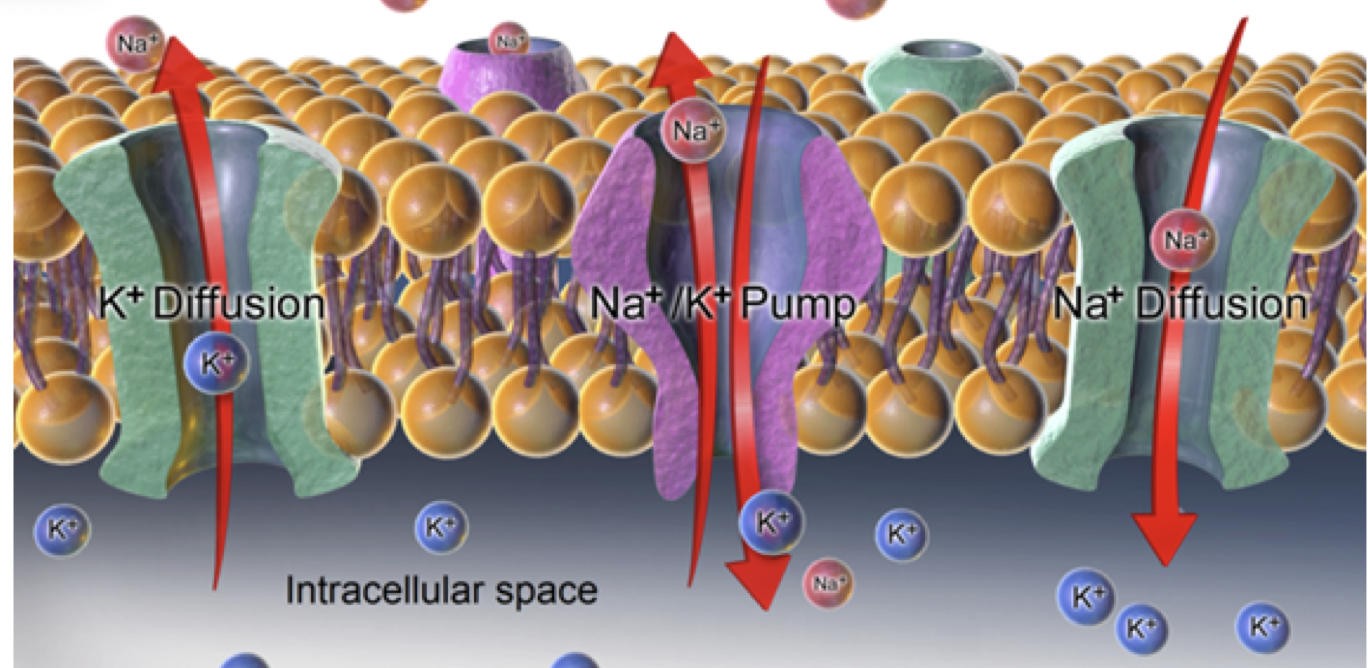 The pump moves 2 K⁺ ions in and 3 Na⁺ ions out. This creates an electrochemical gradient and results in K⁺ diffusing out and Na diffusing in. - However, because the membrane is more permeable to K⁺, more K⁺ moved out by leak channels
