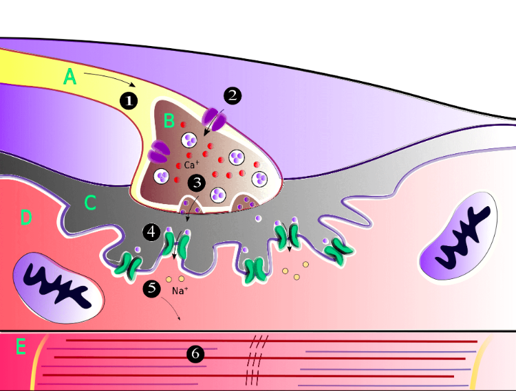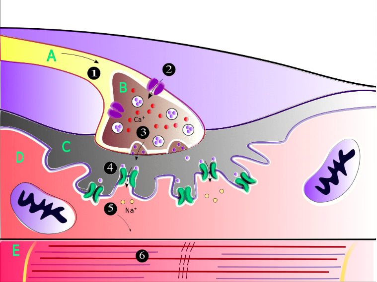 acetylcholine moves across the synaptic cleft to the motor end plate.