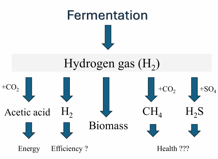 reductive acetogenesis: H2 → acetic acid