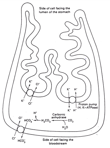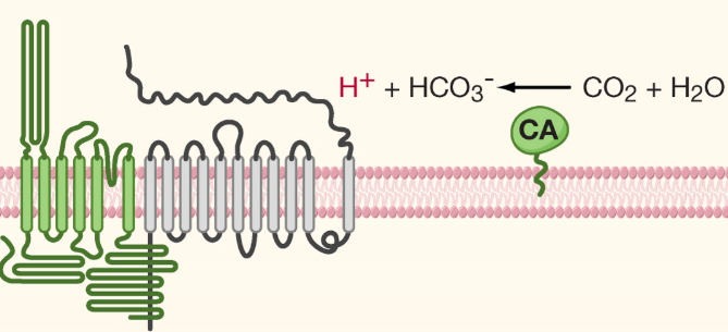 CA = carbonic anhydrase: converts CO2 into bicarbonate ions and a proton (e.g. carbonated drinks)