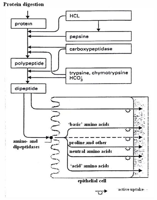 1) absorbed in the enterocyte by non-selective peptide transporters (PEPT1 and PEPT2 = symporters of H+)