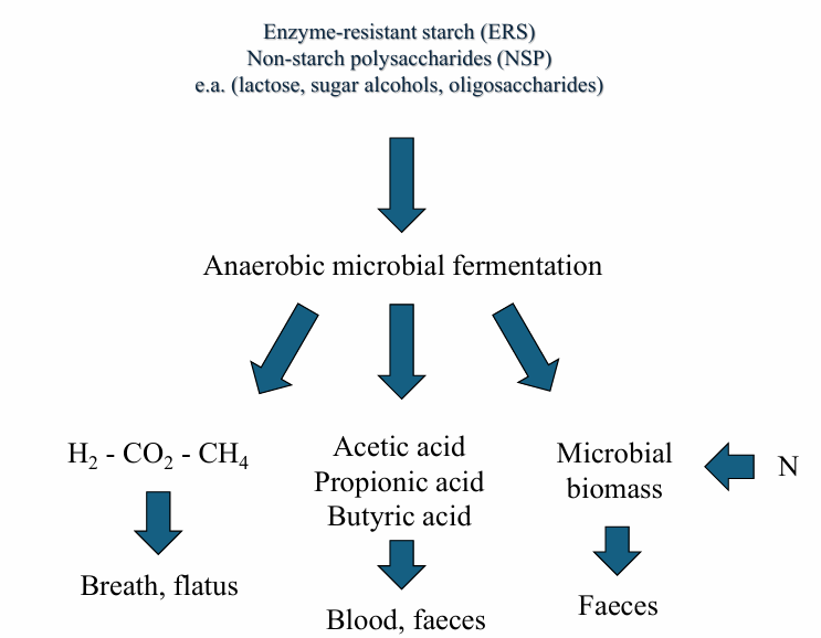 2) residues are fermented by MO in storage organ after stomach and small intestine (= colon): use food substances and nitrogen sources in anaerobic way