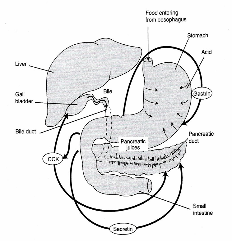 CCK-PZ | Gall bladder, pancreas | Contraction, secretion pancreatic juice/ bile salts | FA and AA in duodenum |