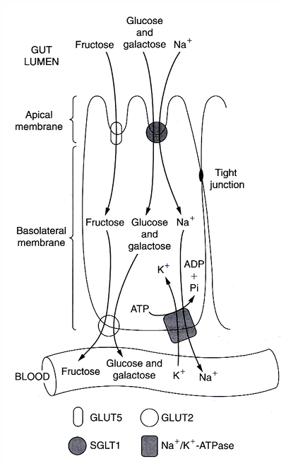 fructose: GLUT5 by facilitated diffusion → only a proportion of fructose can be absorbed + the remaining stays in the lumen causing osmotic diarrhea or is changed to lipids (= liver fattening
