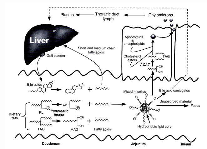 triglycerides → fatty acids → micelle formation → monoglycerides and FFA’s are absorbed